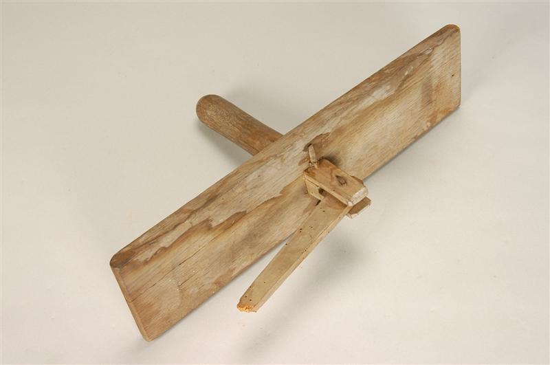 - BeschrijvingEikehouten handvat, gestoken door dito rechthoekige plank, vastgezet met ijzeren nagel en voorzien van in top ingelaten, rond ijzeren nagel scharnierende (vruchtboom-) houten hamersteel