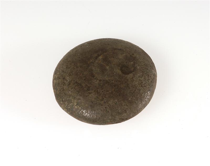 Soldatenknoop, koper (?) gebombeerd, met ingeslagen nr. "8", met restanten garen in het oog