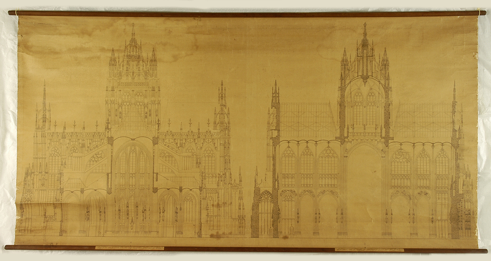 - BeschrijvingOntwerptekening Sint Jan. Doorsnede over de lengte der kruisarmen, gezicht naar het Westen.