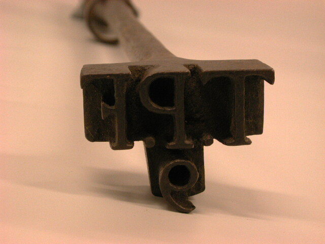 Dit brandmerkijzer draagt in spiegelbeeld de aanduiding "T.P.F" (=travaux perpétuels forcé? verzwaarde zeer langdurige/levenslange dwangarbeid, later verzwaarde tuchthuisstraffen tot maximaal 20 jaar ?). Standaard en ijzers werden gebruikt te 's-Hertogenbosch. Het oudste ijzer is voorzien van een galg, de overige stammen uit de Franse tijd. De letters geven de straf aan. De aanduiding 'T.F.' bijvoorbeeld, betekent 'Travaux Forcés', dwangarbeid. Zie verder inv.nr. 6863