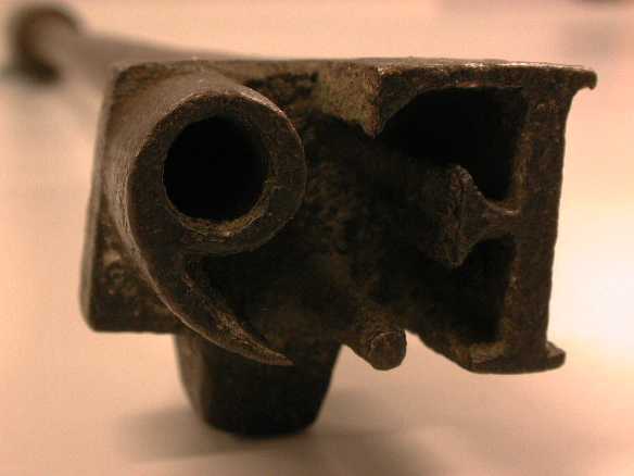 - BeschrijvingDit brandmerkijzer draagt in spiegelbeeld de aanduiding "F.g" (=faussaire: valsheid in geschrifte, valsemunterij e.d.). Standaard en ijzers werden gebruikt te 's-Hertogenbosch. Het oudste ijzer is voorzien van een galg, de overige stammen uit de Franse tijd. De letters geven de straf aan. De aanduiding 'T.F.' bijvoorbeeld, betekent 'Travaux Forcés', dwangarbeid. Zie verder inv.nr. 6863