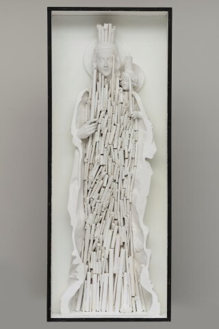 De basis van het beeld (de rug) bestaat uit een doorgezaagd oud gipsen beeld. Frenken heeft daar allerlei losse elementen aan toegevoegd zoals het gezicht van Maria, het kind en de handen. De twee gipsen hoofden zijn afkomstig van een beeld van de Zoete Moeder van Den Bosch. Het voetje en het handje zijn afkomstig van een houten beeld. De zijkanten zijn ontleend van de achterkant van een ander beeld.
