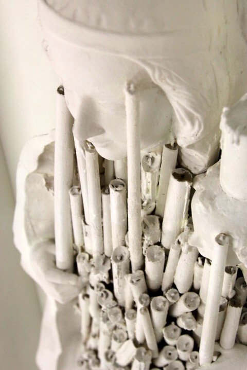 De kaarsen heeft Franken gekregen van de koster van de Sint Jan. Frenken heeft ze gekregen juist vóórdat ze naar een kaarsensmelterij zouden gaan aan het Hinthamereinde. Met witte verf heeft hij de (gelijmde) kaarsen op kleur gebracht.