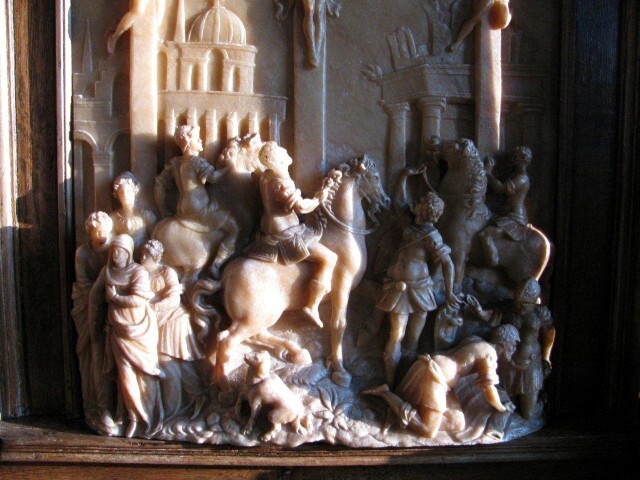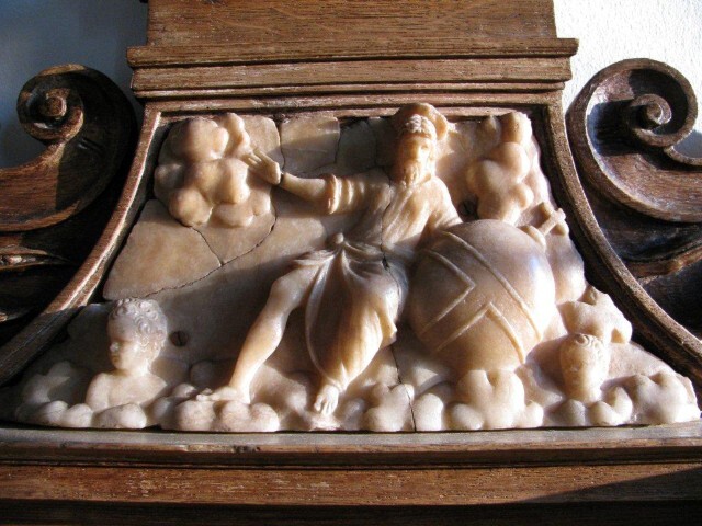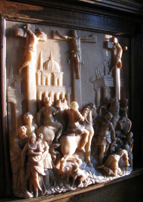 In een eikenhouten omlijsting gevat, twee stukken albast met scènes. Centraal: gekruisigde Christus tussen goede en slechte moordenaar. Drie soldaten te paard en drie rechtsonder. Links op de voorgrond: wenende vrouwen waaronder Maria Magdelena en Maria, een een hond. Achtergrond: klassieke architectuur en ruïne. Boven: God de Vader gezeten op wolken met een rijksappel en twee engelenkopjes die zijn vastgezet met schroeven.