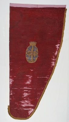 Vaandel van rode zijden damast met een symmetrisch patroon van gestyleerd lofwerk (kerkbaniervorm?). In het midden is op voor en achterzijde van het vaandel een médaillon genaaid. Médaillon in olieverf op linnen: staande weversspoel waarachter een cartouche met de letters "S." (links) en "S V" (rechts). (S. Severus?). Boven het cartouche links van de spoel "16" en rechts "28". Boven het ovaal een kroon. Het vaandel is aan de achterkant (over een hoogte van 147 cm van onderaf) beplakt met rode katoen. Hierbij werd het medaillon vrijgelaten. Het vaandel is langs de schuine zijde en de ronde onderkant afgezet met gele zijden franje. Aan de bovenzijde is een rode linnen broek gezet. De bovenrand is om een dikke stok genaaid. Op de achterkant van de stok zijn 2 blokjes getimmerd.