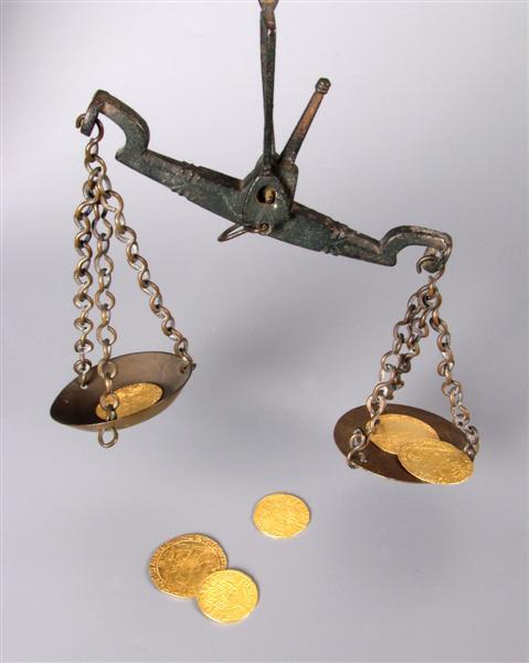 - BeschrijvingIJzeren balansarm met omhoogstaande evenaar, hangend in twee ronde gaten in de klokvormige uiteinden van een langgerekt U-vormige beugel, hangend aan een kort geelkoperen schakelkettinkje met dito ring. Aan de balans twee aan geelkoperen schakelkettinkjes hangende geelkoperen schaaltjes, de een geheel vlak, de ander met opstaande rand.