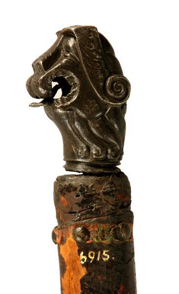 Knop in de vorm van een gefantaseerde dierenkop. Dit exemplaar zou zijn meegebracht van het beleg van Braine-le-conte in 1424. Volgens de overlevering zijn deze afkomstig van de schutterijen van de Oude en de Jonge Voetboog. Ze zouden zijn buitgemaakt bij het beleg en de inname van Braine-le-Comte in 1424. ... Vermoedelijk echter ...