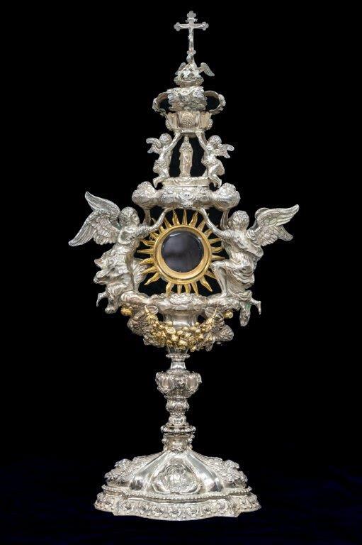 Op het plateau zijn links en rechts van de met een stralenkrans omgeven lunulakast twee knielende engelen aangebracht, die een tweede wolkenplateau dragen waarop een beeldje van Maria staat. Boven het Mariabeeldje wordt door twee knielende kleine engeltjes een grote kroon opgehouden, die versierd is met druiventrossen en engelenkopjes. Bovenop de kroon zijn een pelikaan in een nest, die drie jongen voedt, en een kruis aangebracht.