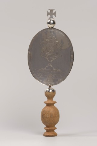 Zilveren processie schildje, ovaal van vorm bekroond met een kruis op een bol. Het schildje is gegraveerd, aan de voorzijde een monstrans en tekst, aan de achterzijde de Heilige Cornelius en tekst. Het schildje is aangebracht op een houder van gedraaid hout, met aan de onderzijde een schroefdraadgat. De houder kan aangebracht worden op een zwart gekleurde hardhouten steel met schroefdraad aan de bovenzijde.