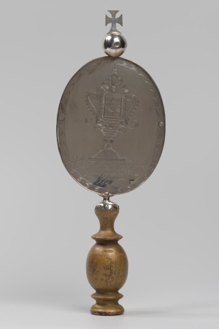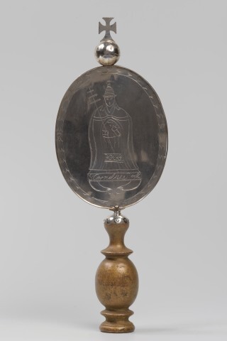 Zilveren processie schildje, ovaal van vorm bekroond met een kruis op een bol. Het schildje is gegraveerd, aan de voorzijde een monstrans en tekst, aan de achterzijde de Heilige Cornelius en tekst. Het schildje is aangebracht op een houder van gedraaid hout, met aan de onderzijde een schroefdraadgat. De houder kan aangebracht worden op een zwart gekleurde hardhouten steel met schroefdraad aan de bovenzijde.