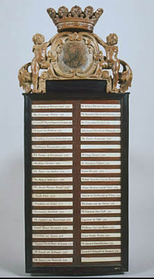 Deze lijst met verwisselbare naambordjes van de schepenen, gezworenen en raden van 's-Hertogenbosch, hing in het stadhuis. De volgorde van de namen werd bepaald door het jaar van benoeming in de schepenbank. De lijst is bijgehouden tot op het moment van de inname van de stad door de Fransen in okt. 1794 en toont de samenstelling van de laatste stedelijke regering van 's-Hertogenbosch tijdens het Ancien Regime.