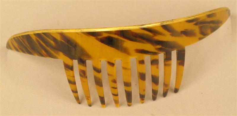 - BeschrijvingVier zwarte haarkammen, een zwarte haarklem en een zwarte halsketting, gedragen tijdens de rouwperiode, alsmede een bruine haarkam, haarspelden en twee hoedepennen, allen omstreeks 1890 gedragen te Ravenstein