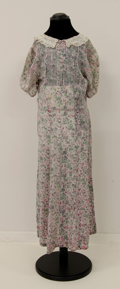 - BeschrijvingDeze jurk is in 1945 uitgedeeld in het kader van de Hulpactie Roode Kruis. De jurk is afkomst uit de Verenigde Staten. Katoenen jurk met bloemetjesmotief over het hele oppervlak. Korte mouw, kanten kraag.