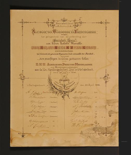 Oorkonde Koninklijke Handboogschutterij Unie te 's-Hertogenbosch, 26 januari 1846