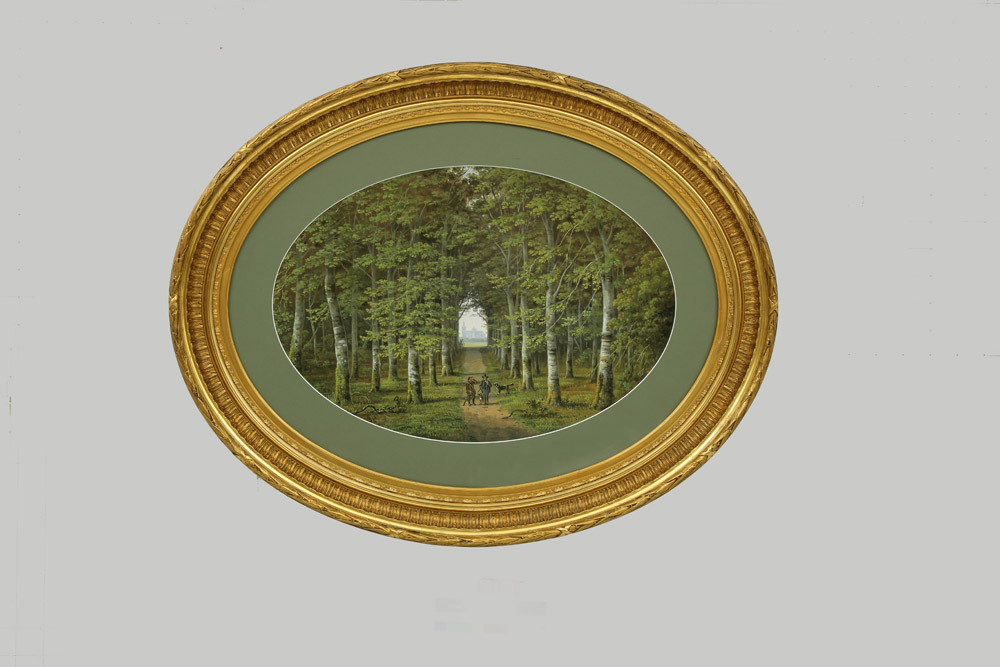 Jagers op een boslaan, aan de horizon de Sint Janskathedraal van 's-Hertogenbosch