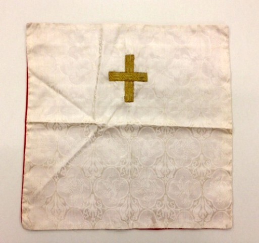 Kelkvelum van gebroken wit damast met een kruis in goudkleurige band. De binnenzijde is van rood velours.
