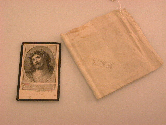 - BeschrijvingWit linnen doekje met initialen "J.B.K.". Doodsprent van de kunstschilder Johann Bernhard Klombeck.