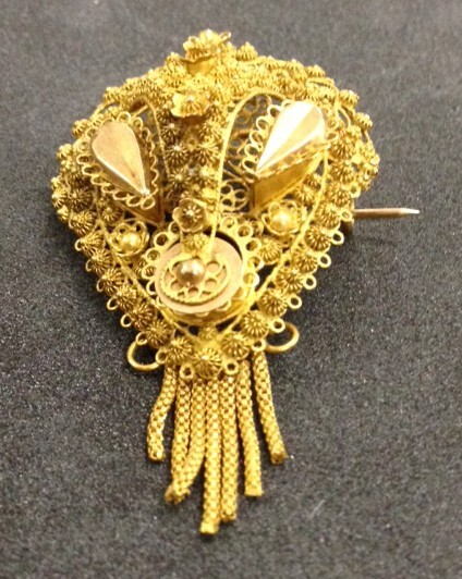 - BeschrijvingMet bloem- en siermotieven versierde broche, versiering in ajour uitgevoerd. Speld aan achterzijde.