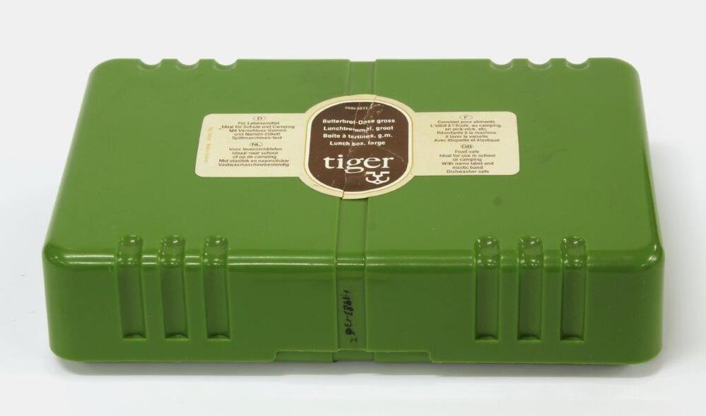 - BeschrijvingGrote lunchtrommel uitgevoerd in donkergroen plastic. Bestaand uit een trommel en deksel met elastiek. Heeft een productsticker.