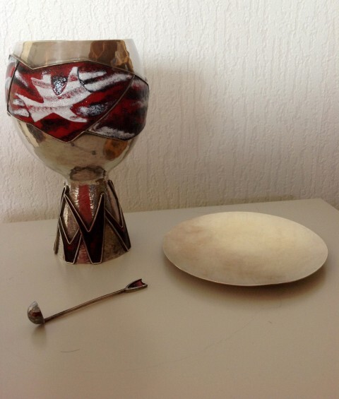 Ronde voet, stam naar boven taps toelopend tot onderaan kokosnootvormige cuppa. Op de voet V-vormige versiering: in zilveren banden gevat email in rood en donkerbruin. Op cuppa asymmetrische vormen, gehoekt met randen gevat email in rood, wit, donkerbruin. Bovenrand cuppa niet geheel rond. Onder de voet een inscriptie evenals op de onderzijde van het lichaam. Vier merken op de buitenzijde van de cuppa.De kunstenaar heeft getracht de Geestkracht van het Bloed uit te beelden door de bolvorm van de beker (volheid). In de bloedstroom van email is de duif getekend, symbool van de Heilige Geest. Op de voet van de kelk staan oranje figuren, biddende mensen, ontvankelijk voor de zegeningen van het Bloed.