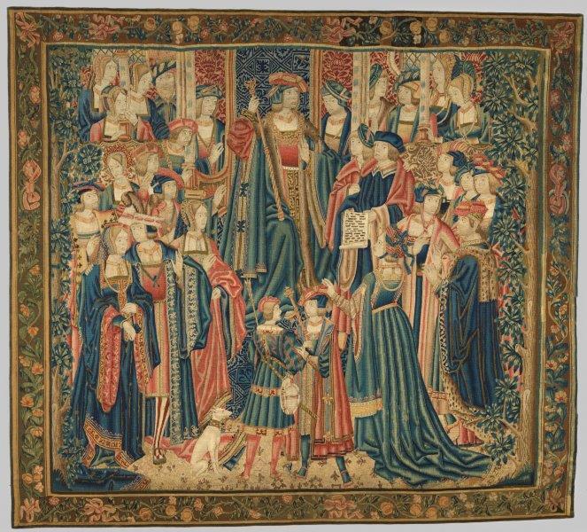 - TitelWandtapijt met voorstelling van een hofscène met een vorst op de troon, omringd door hovelingen