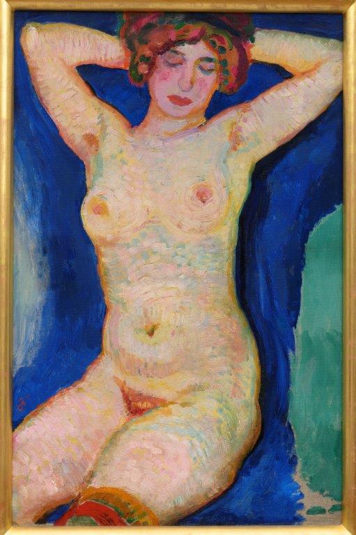 - BeschrijvingZittend naakt (Greet van Cooten, geliefde van de kunstenaar) met haar handen achter haar hoofd, tegen een blauwe achtergrond.
