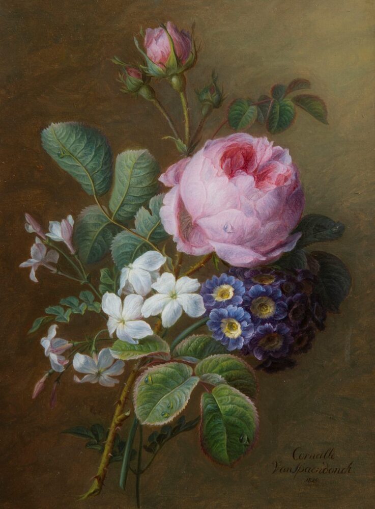 - TitelBoeket van oude rozen, jasmijn en sleutelbloemen