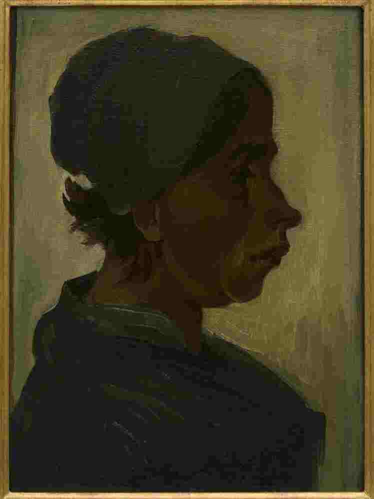 In Van Goghs Brabantse werk is dit portret relatief kleurrijk omdat hij hier een lichte, gekleurde achtergrond toepaste waarbij het gezicht duidelijk leesbaar is. Vincent Van Gogh schilderde graag boeren en landarbeiders in de omgeving van Nuenen. Met hun doorleefde gezichten vertegenwoordigden zij het zware boerenleven. Dit schilderij 'Kop van een vrouw' is onderdeel van een belangrijke serie van 47 kopstudies die Van Gogh maakte als voorbereiding op het schilderen van mensfiguren. Kort na deze studies schildert hij zijn eerste meesterwerk 'De aardappeleters'. Het markante gezicht van de vrouw in dit portret is door Van Gogh meer dan eens vast gelegd. dat hij kort na deze studies maakte. Van Gogh heeft het markante gezicht van deze vrouw vaker vastgelegd, mogelijk is zij dus één van zijn favoriete modellen geweest.