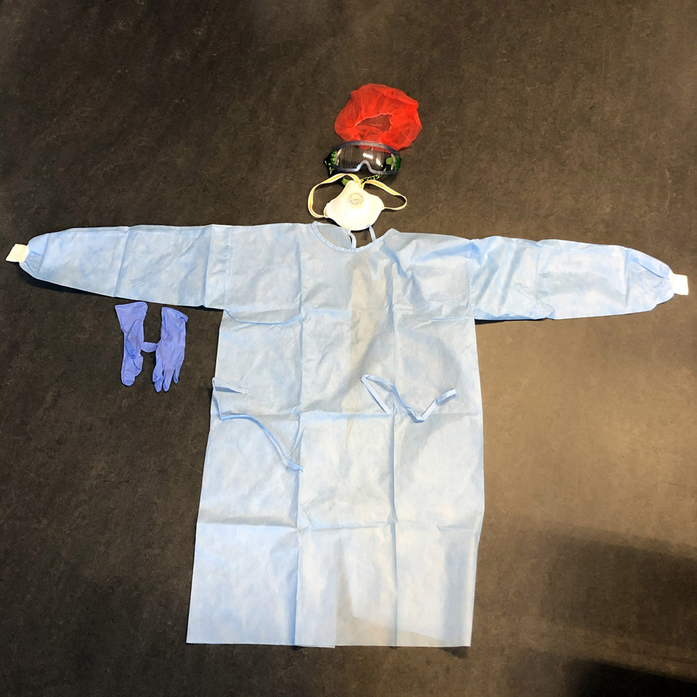 - BeschrijvingSet beschermende ziekenhuiskleding bestaande uit een mondmasker, handschoenen, haarnetje, bril en schort.