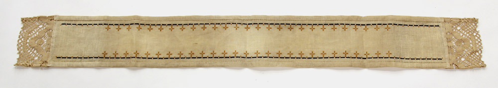 - BeschrijvingAltaardwaal van borduurlinnen, met daarop aan beide lange zijden een zwarte geborduurde rand, waarop okergele kruizen zijn geplaatst. Aan de uiteinden zitten strookjes kant.
