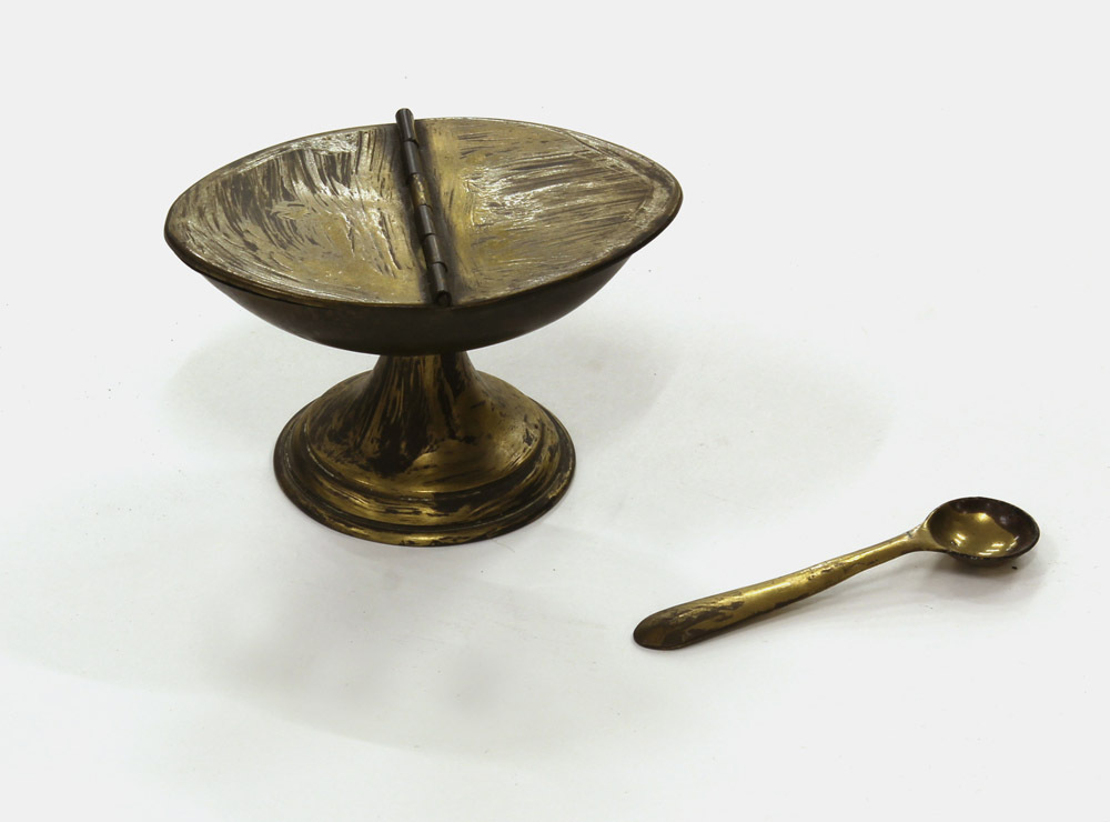 - BeschrijvingIn het midden scharnierend deksel. Cilindrische voet, verjongend naar aanzet van (verlijmde) schaal. Scheepje is gevuld met wierook.