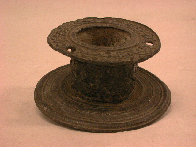 - BeschrijvingOp een enigszins geprofileerde ronde voet staat een cilindrisch vat, rondom versierd met bandwerk, cartouches en mascarons. Brede, uitstekende bovenrand versierd met bladmotieven. Bovenrand heeft 3 doorboringen
