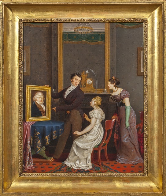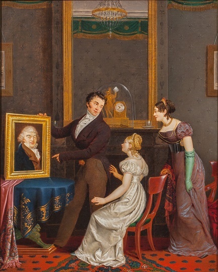 Elegant drietal in bewondering voor het portret van Gerard van Spaendonck
