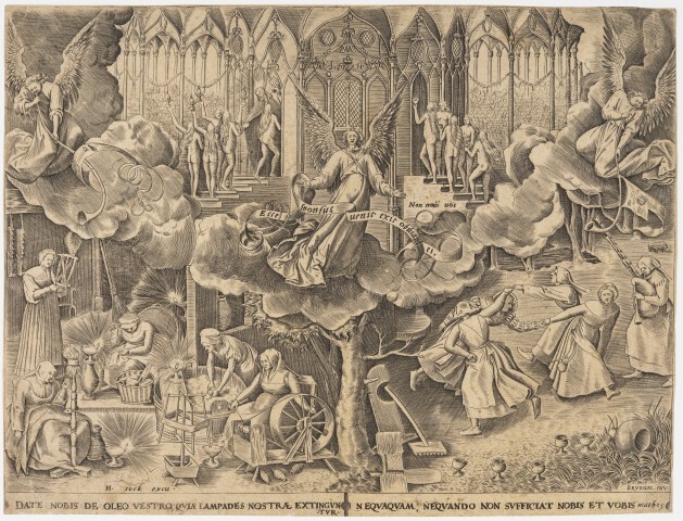 In het midden een boom die zich vertakt in de wolken. Op deze wolken een gevleugelde engel met een banderol waarop de tekst: " ecce sponsus venit et exit obuiam ei ". In een ruimte die doet denken aan een kerk gaan de tien maagden binnen, vijf van hen worden ontvangen door Christus; linksonder zijn de wijze maagden aan het werk bij het licht van olielampen. Rechts vier dansende vrouwen en een die de doedelzak bespeelt, terwijl op de voorgrond vijf gedoofde lampen staan.