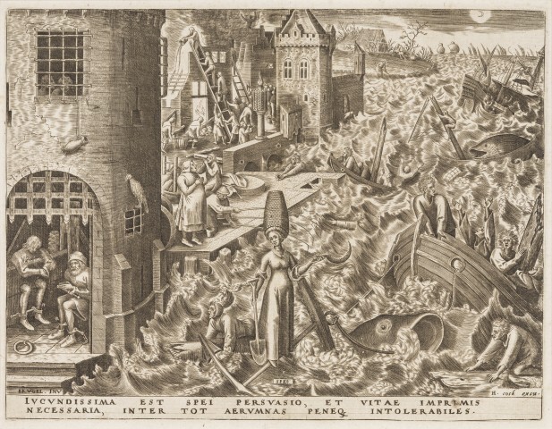 Onderschrift: "IVCVNDISSIMA EST SPEI PERSVASIO, ET VITAE IMPRIMIS/ NECESSARIA, INTER TT AERVMNAS PENEQ INTOLERA-BILLES." Uit de serie van 7 deugden. Enige staat.