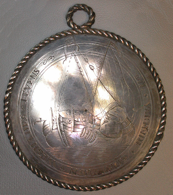Voorzijde: gekroond wapen van 's-Hertogenbosch geflankeerd door twee wildemannen. Randschrift: "PIETER * MAAS * DEKEN * VANT * SCHIPPERS * GILDE * ANNO * 1768 *" Achterzijde: varende zeilboot met drie personen. Randschrift: "A * VARENDE * KORT * DEN * WEGH * DES * LEVENS *" Rand in de vorm van een kabel die ook het oog vormt.