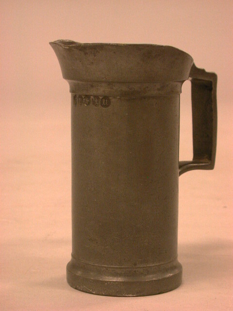 - BeschrijvingTinnen decilitermaat van het klassieke model, daterend uit de tweede helft van de 19e eeuw. Op de handgreep de maataanduiding "NED MAATJE DECILITRE". De maat is voorzien van 4 ijkmerken (1861-1864) en een ijkmeesterteken (J. Everts, zie Dubbe, 1978, p 139).