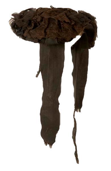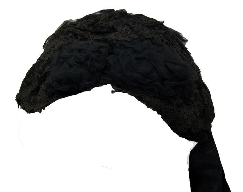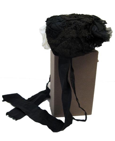 Het hoedje heeft als basis een kapje van stijf wit en écru gaas. Over het gaas is zwart fluweel genaaid. Op het fluweel stroken zwarte machinale kant. Boven op de hoed, in het midden, strikken van zwarte katoenen mousseline en zwarte zijde. Langs de onderrand 2 rozetten van zwarte katoenen mousseline. 2 Zwarte zijden riblinten worden onder de kin gestrikt. Onder de riblinten 2 smalle zwarte zijden lintjes