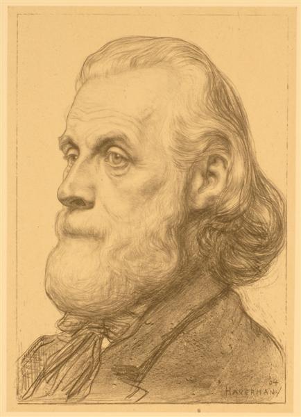 - BeschrijvingGeportretteerde was de oprichter van de Sociaal Democratische Bond. Een oudere heer, met forse baard en lang krullend haar, dat achterover gekamd is. Het lichaam is half naar links gewend. Onder de kin een vlinderdas.