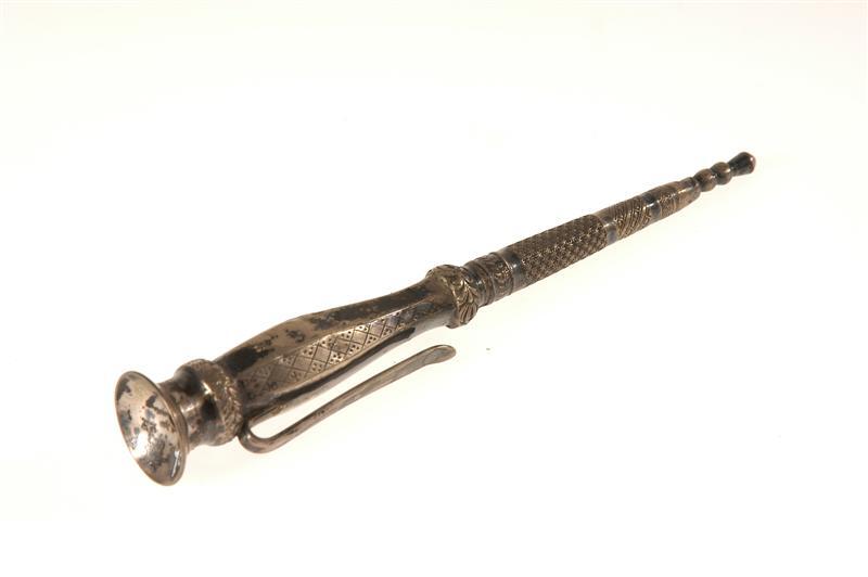 - BeschrijvingZilveren breischei met clip. Gegraveerde en ingeslagen versieringen. Van boven naar onder smal toelopend. In het komvormige bovenste gedeelte een gat.