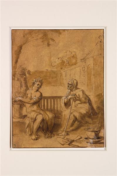 Een oude vrouw, geleund op een stok, zit tegenover een jonge vrouw. De jonge vrouw houdt met haar rechterhand een mand met vruchten vast.Links staat een boom. Achter de vrouwen een hekje en op de achtergrond een binnenplaats met een gebouw. Voor de oude vrouw een tuinvaas, een schop en een hak. Vertumnus was de Romeinse beschermgod van tuinen en fruit. Hij kon zich in allerlei gedaanten veranderen. Hier heeft hij zich verandert in een oude vrouw om zo het vertrouwen te winnen van Pomona, waar hij verliefd op is.