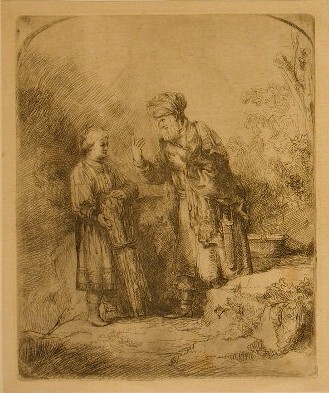 - BeschrijvingIn een landschap spreekt Abraham Izaak toe, met de vinger van zijn rechterhand opgeheven.