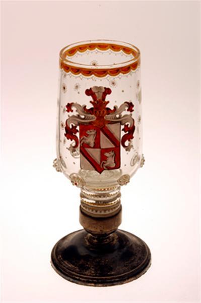- BeschrijvingVerzilverde gewelfde voet met dito korte vaasvormige stam waarin glazen stam met vier ringen. Slank omgekeerd canopische cuppa met 6 opgebrachte frambozen langs de onderrand. De cuppa beschilderd in rood, wit en oranje, met o.a. het wapen van (waarschijnlijk) de Baronnen Puhler von Weitteneck uit Oostenrijk, waaronder staat Aº1669.