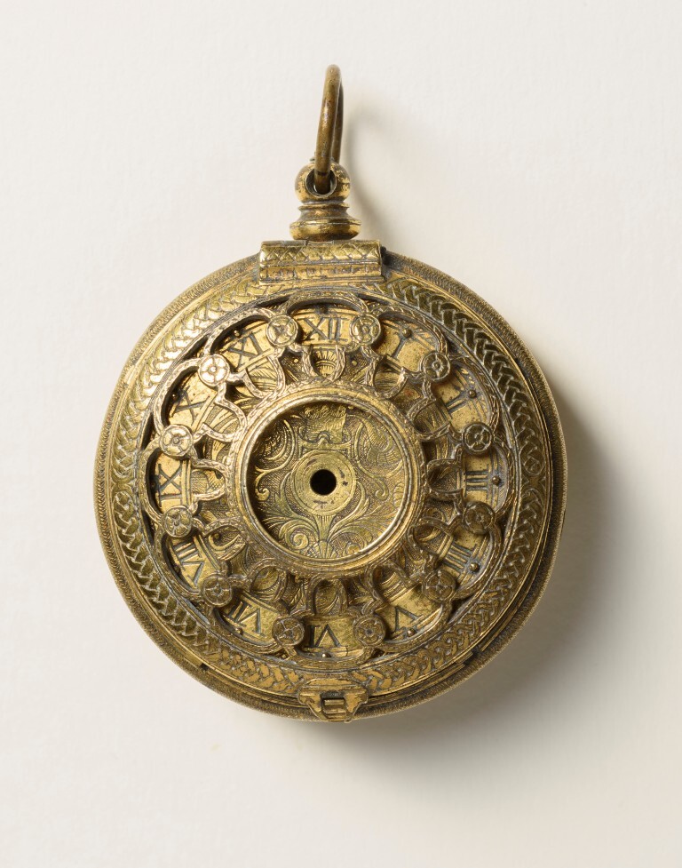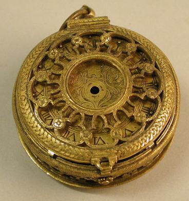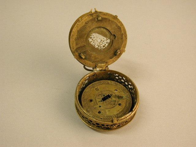 - BeschrijvingRonde, geheel open gewerkte kast, met dito deksel met groteskachtige decoraties gegraveerde wijzerplaat met romeinse cijfers. Van het inwendige rest slechts één gegraveerde steunplaat met de woorden SLACHWERCK EN AEYGER Op de binnenzijde van de deksel: Danyel Smy(s?)kens In Embden fecit