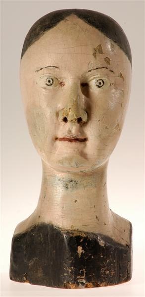 - BeschrijvingUit hout gesneden vrouwenhoofd. Gezicht beschilderd in natuurlijke kleuren, het haar zwart. Zwart geschilderde voet. (Ook wel "Poppelies" genoemd.)
