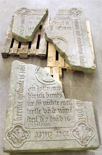 - BeschrijvingGrafzerk van pastoor Matheus Willemssz., Mert en Anna Wilms, en Mechtelt Henrick Berntsdochter.