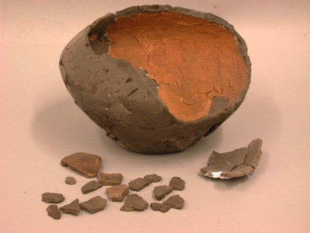 - BeschrijvingNr. 5. Vroeg Germaans. Onderstuk van een gesausde, dunwandige urn van afgeknot, ongelijk-dubbel conische vorm. Inhoud lijkbrandresten