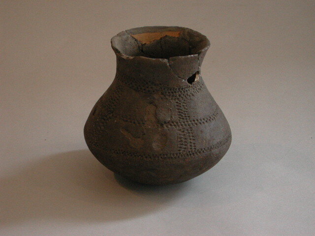 Donkerbruine versierde urn, bodemstuk bolvormig met zeer klein standvlak. Middenstuk afgeknot-kegelvormig, hals afgeknot-kegelvormig. Rand niet verdikt en een weinig uitstaand. Middenstuk door met uitgestoken lijnen begrensde omlopende banden versierd, verticaal door een of twee naast elkaar aangebrachte banden verbonden, die nog vaag aan het zig-zag ornament der schuinsteekversiering herinneren. Inhoud lijkbrandresten