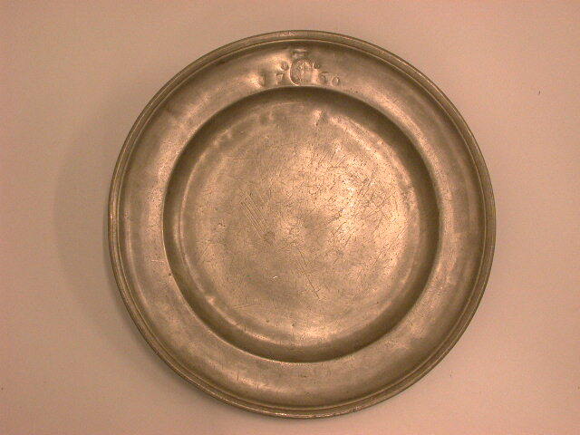 - BeschrijvingTinnen prijsbord. In de rand aan de voorkant ovaal eigendomsmerk met St. Sebastiaan en de initialen SS en een wapenschild. Naast dit merk ingeslagen eigenaarsinitialen WG en ingeslagen datering 1760.