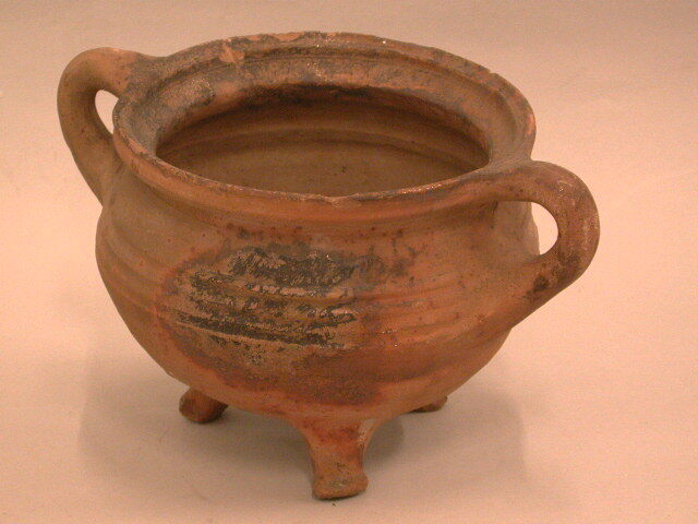 - lensvormige bodem - aangeknepen standvoetjes - gedrongen bolvormige buik met scherpe draairingen op de schouder - uitstaande geprofileerde rand met dekselgroef - 2 vertikale worstvormige oren aangezet op schouder en mondrand - spaarzaam bedekt met geelbruin loodglazuur - door de stand van de pootjes staat de pot scheef - in de grape een ijzeren drie-pootje